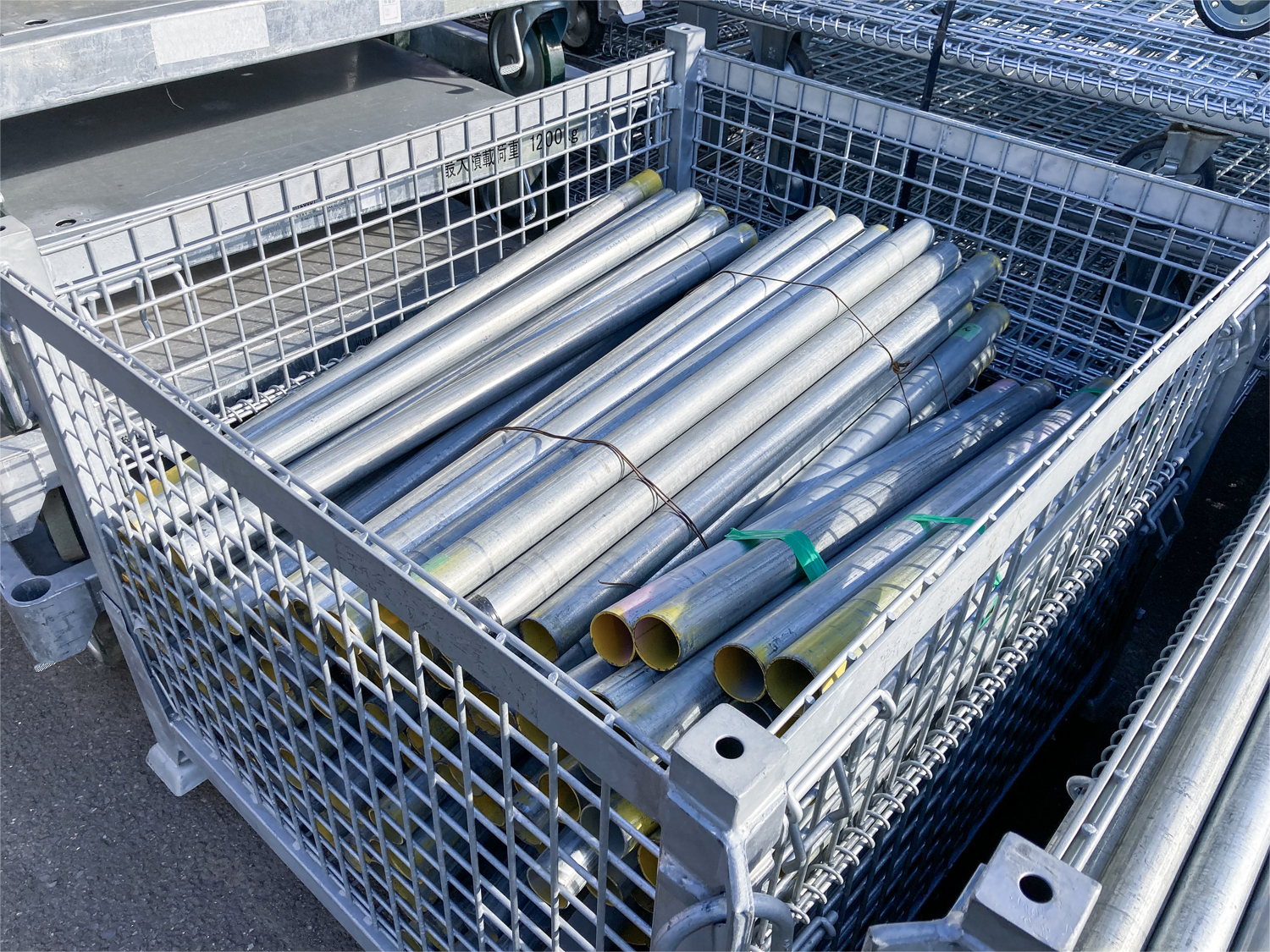 丈夫で大容量な吊りパレットは、軽仮設の資材保管に最適です。