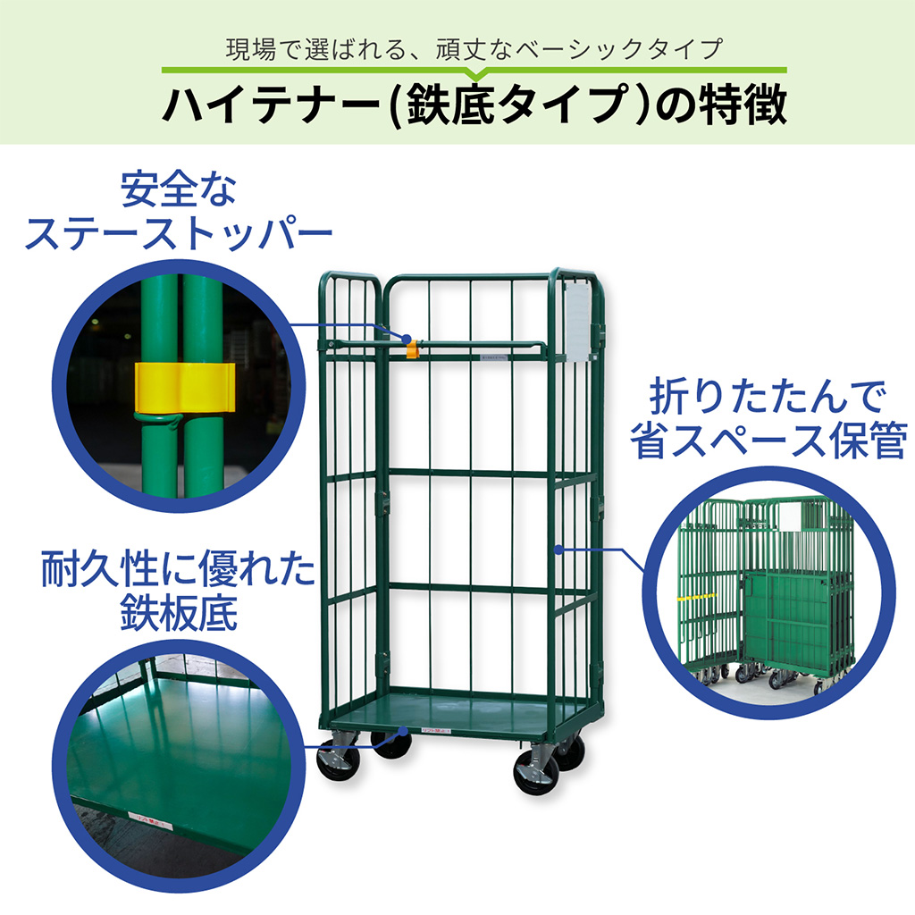 鉄底を使用したベーシックタイプのハイテナー。荷崩れしにくく重量物も安定して運搬できます。