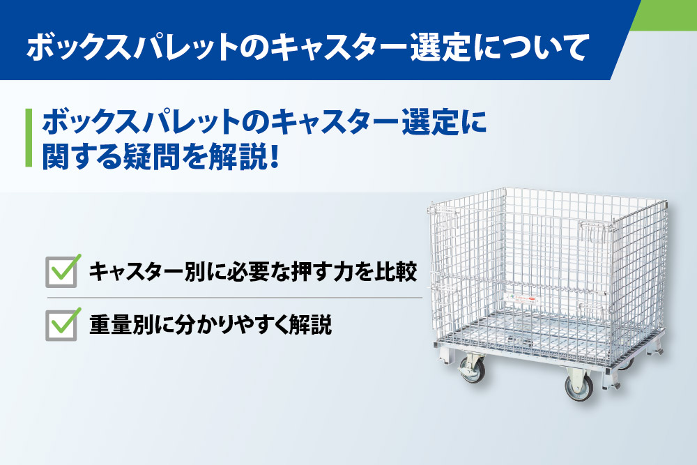 今回は、試験をもとに、重量ごとにどれくらいの力でボックスパレットを押す力が必要なのかキャスター別に解説します。