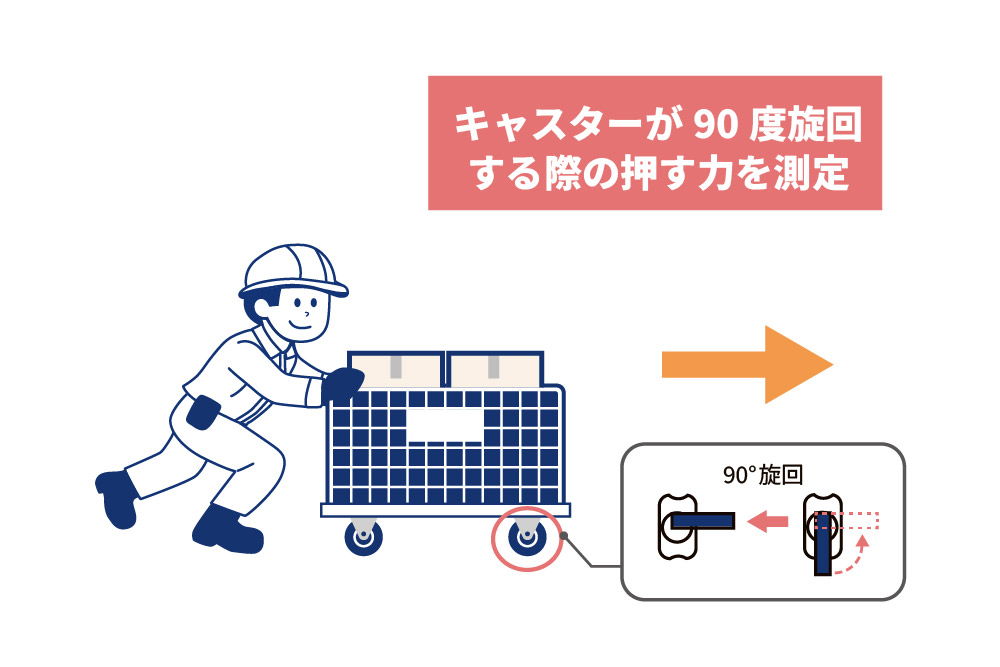 今回は、実際の運搬作業でも負荷が大きくなるキャスターが90度旋回する際に必要な押す力に注目して比較を行いました。