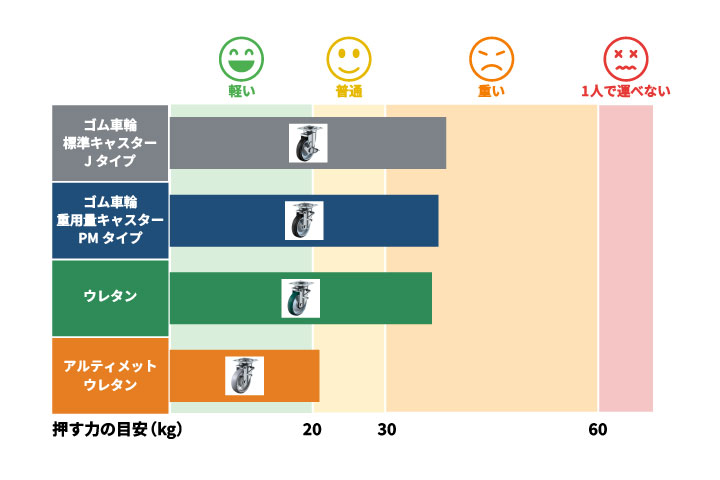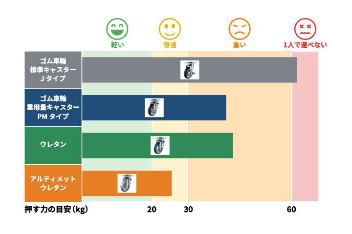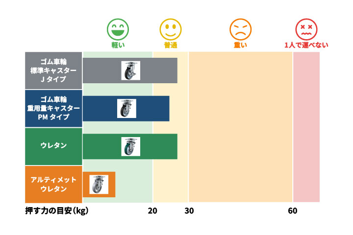ゴム車輪やウレタン車輪の場合は約25~27kg程度の力が必要となり、「普通」程度の負荷となります。